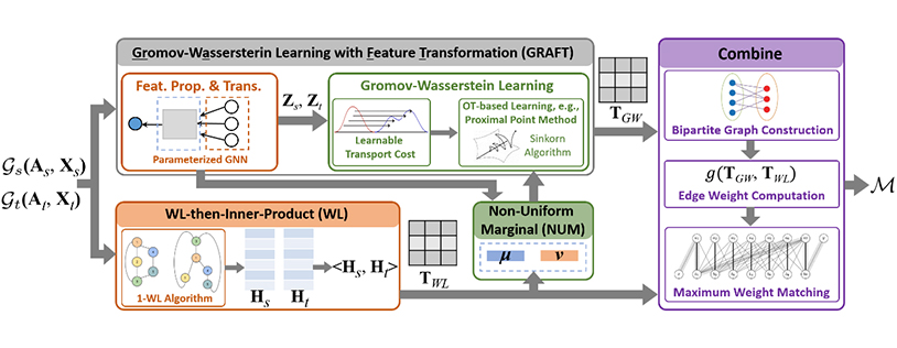 给定一对源图和目标图,无监督图对齐(Unsupervised Graph Alignment)旨在没有种子节点的场景下,识别源图和目标图节点之间的对应关系。尽管现有的方法取得了较好的预测精度,模型表达能力与区分节点对之间是否匹配的关系尚未被探索,同时现有的基于学习的方法不能保证节点一对一对齐的性质,进而使得预测精度下降。基于此,本文融合基于最优传输和嵌入的方法,提升模型区分节点对匹配的能力,同时构建非均匀分布建模节点之间的关系,提升最优传输理论建模图对齐问题的适配性。最后,我们将无监督图对齐问题转换为最大权重匹配问题,通过集成策略构建边权重,不仅保证节点匹配的性质,同时进一步提升预测精度。最终,我们的模型在广泛的数据集上取得卓越的性能,相比以往的方法精度提升超越10%,并具备良好的扩展性。