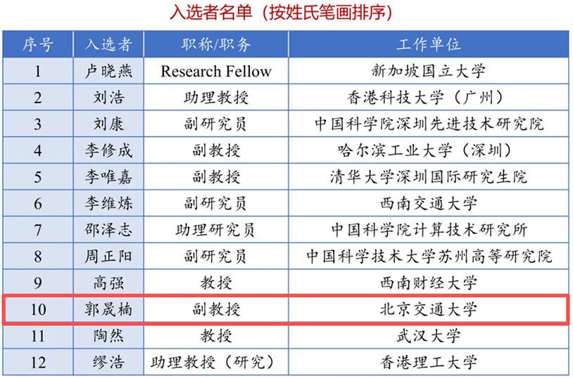 我所郭晟楠老师因其在“时空数据智能及其在交通领域的应用”方面的突出贡献得以成功入选本年度的空间数据智能新星学者名单。郭晟楠老师近年来发表高水平学术论文60余篇,其中以第一或通讯作者发表CCF-A类会议和IEEE/ACM汇刊论文20余篇。谷歌学术引用量8600余次,其中1篇一作论文的单篇引用量超过3800次,2篇一作论文入选ESI高被引论文,连续4年(2022-2025)入选斯坦福大学全球前2%科学家榜单,连续2年(2024-2025)入选爱思唯尔中国高被引学者榜单。主持国家自然科学基金、北京市自然科学基金、中国博士后科学基金等各类科研项目10余项。相关技术成果在公路、物流、民航等领域的多个业务场景成功落地应用。先后获得北京市科技进步二等奖(已公示,排2)、中国计算机学会科技进步二等奖(排2)和中国航空运输协会民航科学技术二等奖(排10)等科研奖励。