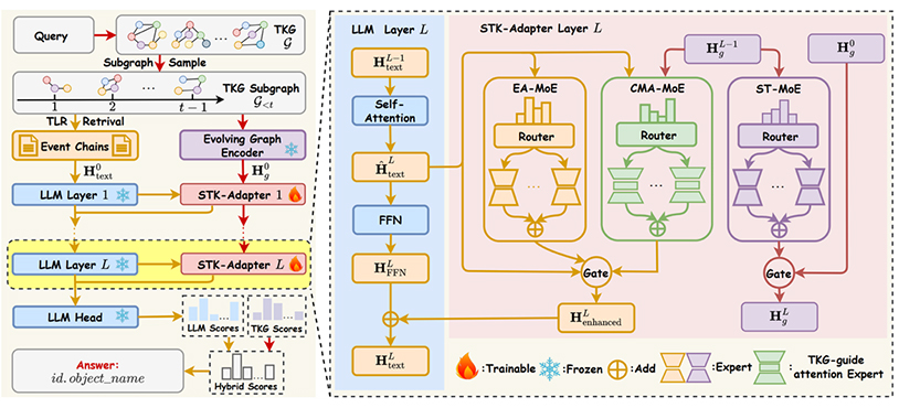 时序知识图谱(TKG)外推旨在基于历史事实预测未来事件。近期的研究尝试将 TKG 的演化结构表示与文本事件链整合到大语言模型(LLM)中以提升推理能力,但面临图演化结构表示与 LLM 语义空间对齐不足以及结构特征在LLM微调过程中被逐渐稀释的问题。为此,研究团队提出时空知识适配器(STK-Adapter),通过将演化图编码器与 LLM 灵活整合以促进 TKG 推理。具体而言,设计时空混合专家模块以建模 TKG 的空间结构与时间演化模式;引入事件感知混合专家模块以捕捉事件链中的时间语义依赖;同时构建跨模态对齐混合专家模块,通过 TKG 引导的注意力机制实现深层跨模态对齐。在多个基准数据集上的实验结果表明,STK-Adapter 显著优于现有最先进方法,并在跨数据集场景中展现出良好的泛化能力。