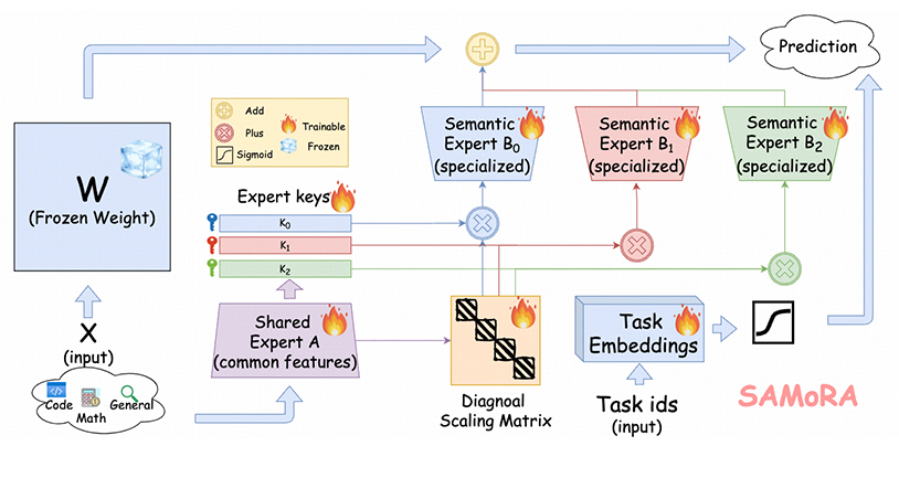 大型语言模型(LLM)的多任务学习是人工智能与自然语言处理领域的重要研究方向,而混合专家架构(MoE)与低秩微调(LoRA)的结合在提升模型多任务学习能力方面展现出了巨大的潜力。然而,现有的 MoE-LoRA 方法面临两大挑战:一是“路由不精准(Imprecise Routing)”,无法将输入语义与专家能力进行显式匹配,导致专家专业化程度较弱;二是“统一的权重融合策略(Uniform weight fusion)”难以提供自适应的更新强度,忽略了不同任务在复杂度上的显著差异。针对上述问题,研究团队提出了一种专为任务自适应学习量身定制的新型参数高效微调(PEFT)框架——SAMoRA(基于语义感知的混合 LoRA 专家模型)。该方法提出了一种语义感知路由器(Semantic-Aware Router),将文本语义与最合适的专家进行显式对齐,从而实现精准路由。同时,研究团队设计了任务自适应缩放机制(Task-Adaptive Scaling),能够根据特定的任务需求动态调节专家的贡献度。此外,该工作还引入了一种新颖的正则化目标,协同促进专家专业化与有效的自适应缩放。实验结果表明,SAMoRA 在多个多任务学习基准测试中均显著优于现有最先进(SOTA)的方法,并展现出了卓越的任务泛化能力。